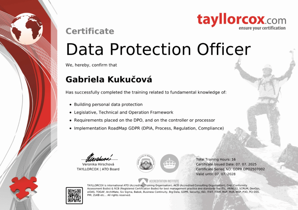 Připravíme dokumenty, které budou reflektovat vaše potřeby, zaměstnanci i vy jim budete rozumět. Jsme držiteli certifikátu Pověřenec pro ochranu osobních údajů (DPO).
